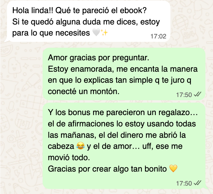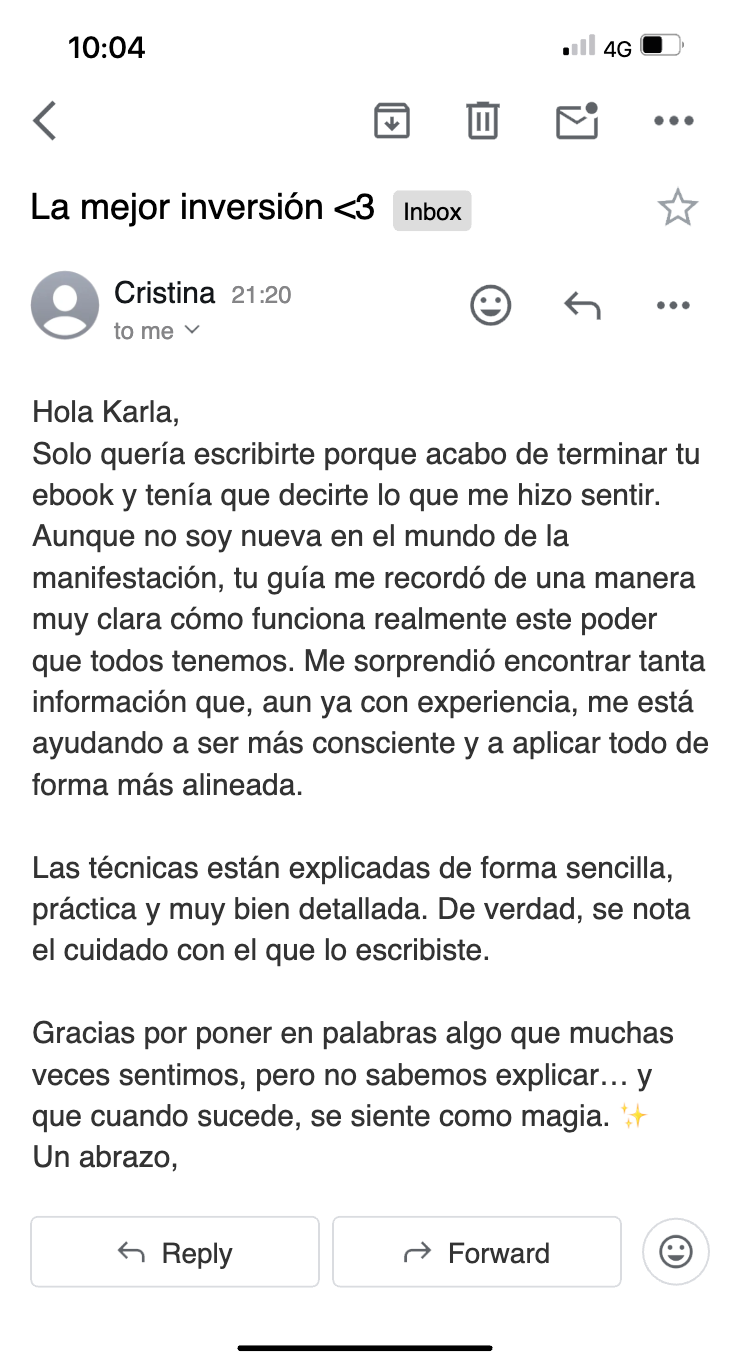 “Nunca había probado nada de manifestación, y me sorprendió lo práctico que es. Los ejercicios son sencillos pero potentes, y realmente me ayudaron a enfocarme en lo que quiero atraer.”